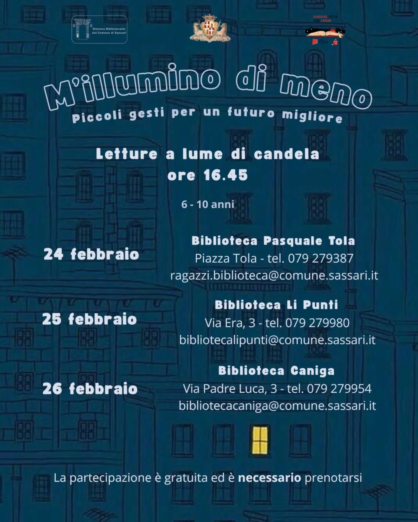 In occasione della Giornata Nazionale del Risparmio Energetico e degli Stili di Vita Sostenibili, promossa da Caterpillar e Rai Radio 2 dal 2005, le biblioteche comunali di Sassari organizzano tre incontri di letture a lume di candela per diffondere la cultura della sostenibilità ambientale e del risparmio delle risorse.